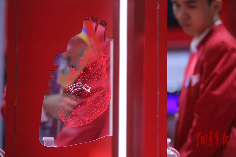 11月10日,上海国家会展中心,第八届中国国际进口博览会医疗器械及医疗保障展区,一名参观者在观看心脏瓣膜的应用示意装置。中青报·中青网记者 孔斯琪/摄