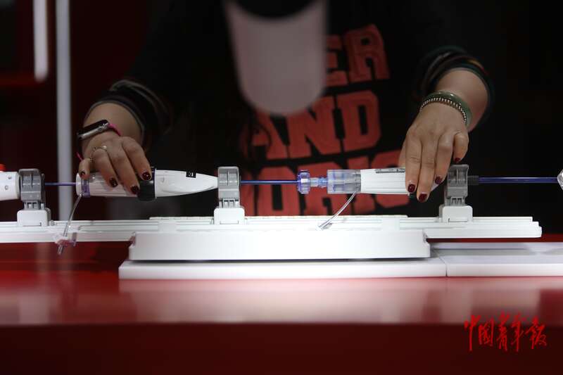 11月10日,上海国家会展中心,第八届中国国际进口博览会医疗器械及医疗保障展区,一名参展商在演示一款经导管瓣膜修复系统。中青报·中青网记者 孔斯琪/摄