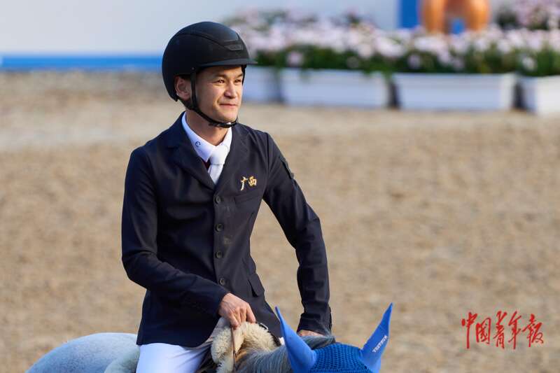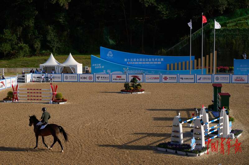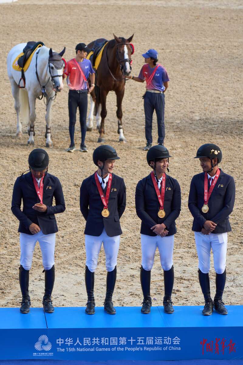 11月17日,广东深圳,光明国际马术中心,十五运会马术场地障碍项目团体赛,由哈扎克拜、洪志华、木拉得力、达布西力特组成的广西队以29分总罚分逆袭登顶,成功斩获团体金牌。中青报·中青网记者 田嘉硕/摄