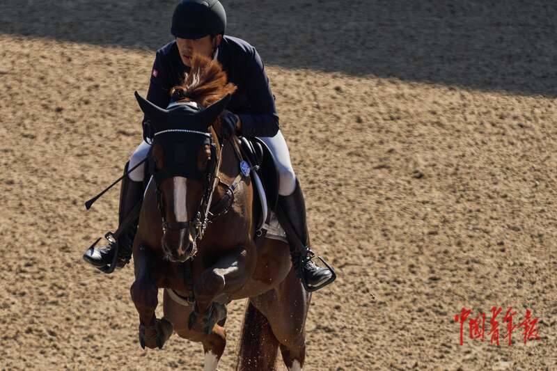 11月17日,广东深圳,光明国际马术中心,十五运会马术场地障碍项目团体赛,北京队周睿弘与赛马“金金”在比赛中。中青报·中青网记者 田嘉硕/摄