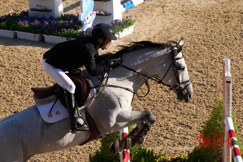 11月17日,广东深圳,光明国际马术中心,十五运会马术场地障碍项目团体赛,河北队巫辉与赛马“卡塔尔”在比赛中。中青报·中青网记者 田嘉硕/摄
