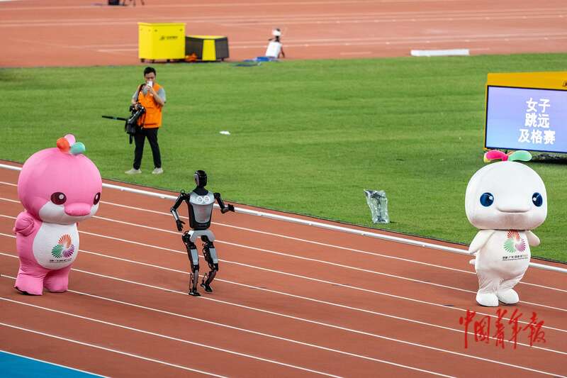 11月17日,广东广州,第十五届全国运动会田径项目赛事开始前,机器人和吉祥物喜洋洋、乐融融在广东奥体中心体育场赛跑。中青报·中青网记者 李隽辉/摄