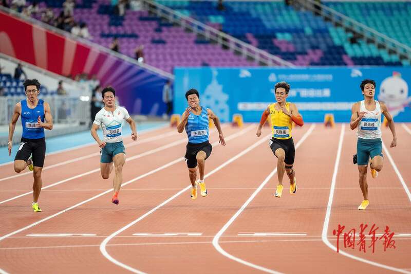 11月17日,广东广州,第十五届全国运动会田径男子100米决赛,湖北选手李泽洋(左一)以10秒11的成绩获得冠军。中青报·中青网记者 李隽辉/摄