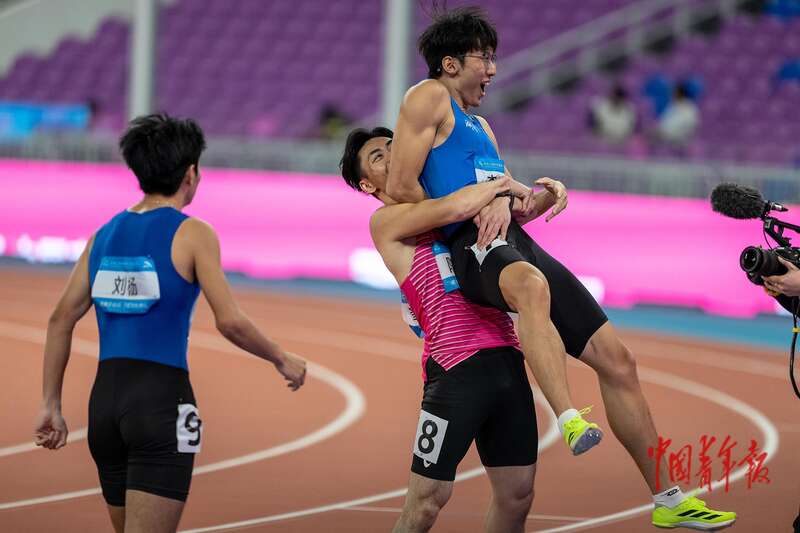 11月17日,广东广州,第十五届全国运动会田径男子100米决赛,湖北选手李泽洋(右)庆祝胜利。中青报·中青网记者 李隽辉/摄