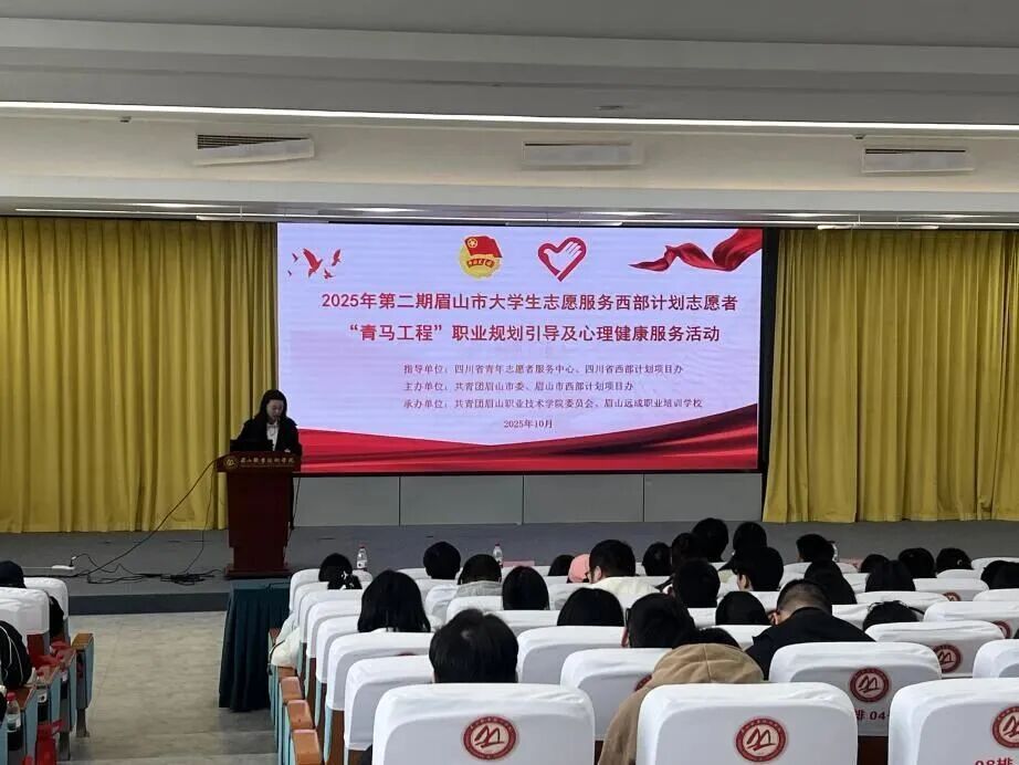 团眉山市委、眉山市西部计划项目办主办的2025年第二期“青马工程”西部计划职业规划引导及心理健康服务活动在眉山职业技术学院举行。市、县级项目办负责人、西部计划志愿者及眉山职业技术学院学生共计200余人参与活动。本次培训分为心理辅导与职业发展指导两个板块。心理辅导课程聚焦基层常见的情绪困扰,结合真实案例解析,传授积极思维方式和“4-7-8呼吸法”等实用技巧。职业规划课程以“时代浪潮与个人航向”为主题,从政策优势、职业适配到未来发展进行深入分析,并针对考公考编问题,提供备考指导,为志愿者明晰职业路径提供有力支撑。