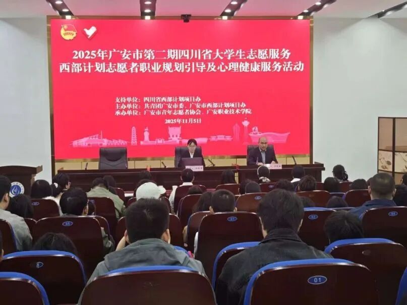 团广安市委、市西部计划项目办在广安职业技术学院开展2025年第二期职业规划引导及心理健康服务活动,全市200余名西部计划志愿者参加活动。培训会上,全体志愿者深入学习党的二十届四中全会精神。随后,相关专家从“思维跃迁、能力盘点、成长路径、实践举措”等方面开展职业规划引导。心理健康辅导课程围绕“心态转换、情绪管理、自我滋养、人际连接”等内容,帮助大家快速掌握心理调适方法。