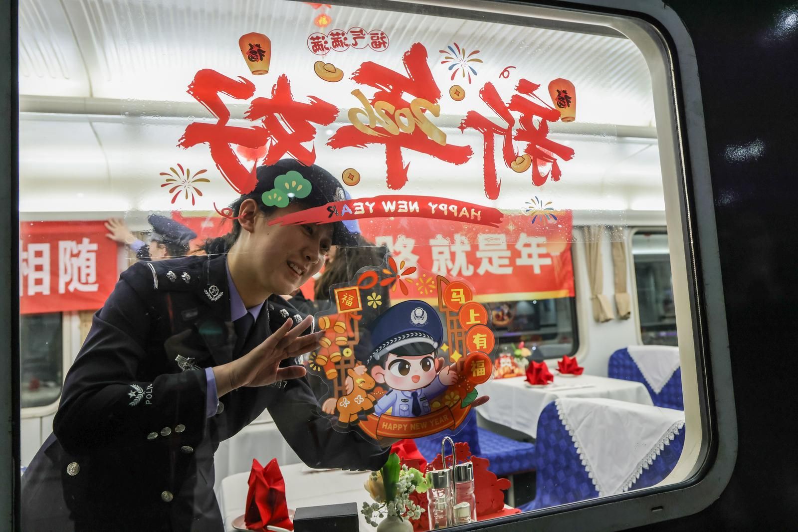 2月2日,北京西站,K4069次列车餐车厢内,铁警布置窗花。中青在线记者 陈思阳/摄