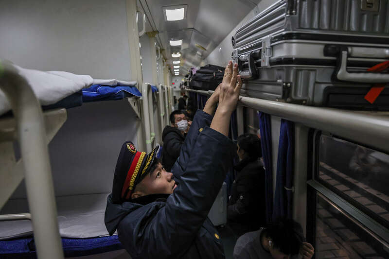 2月2日,北京西站,乘务员在车厢内检查旅客行李的摆放,确保安全。中青在线记者 陈思阳/摄