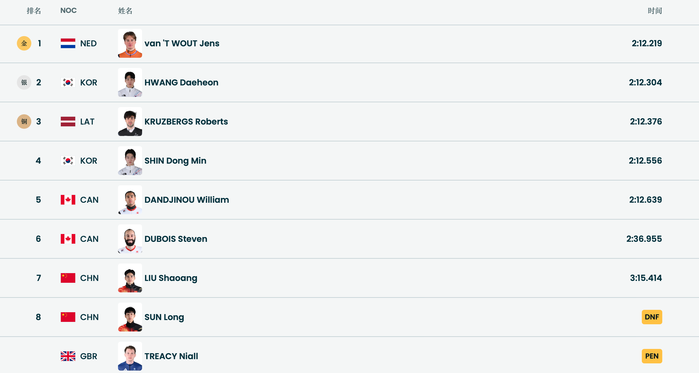 短道速滑比赛的偶然性在今天这场比赛中体现得淋漓尽致。当今世界男子短道速滑第一人、加拿大名将丹吉努依然没有站上领奖台,反倒是荷兰选手范特沃特收获了他在本届冬奥会的第二枚金牌,韩国选手黄大宪获得银牌,拉脱维亚选手罗伯茨·克鲁日贝格斯也幸运地获得了一枚铜牌。