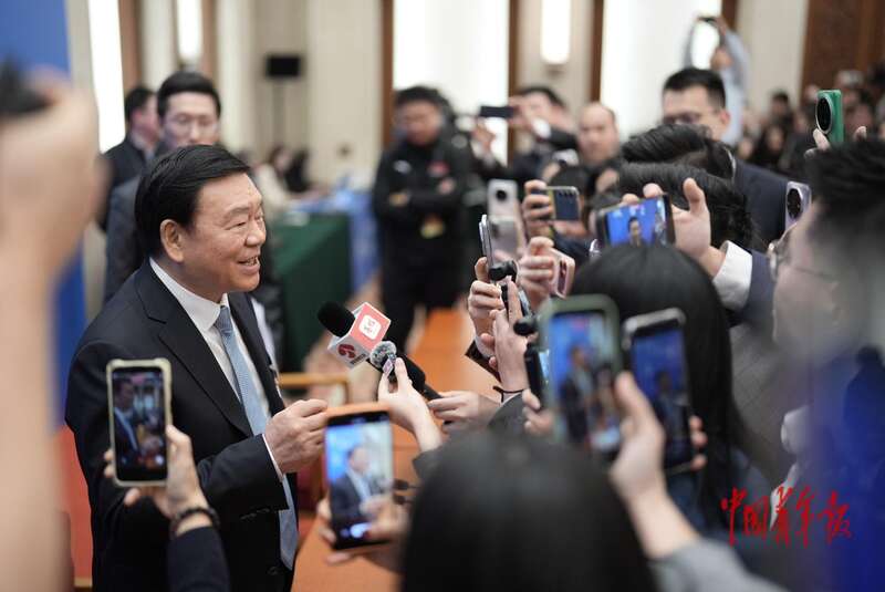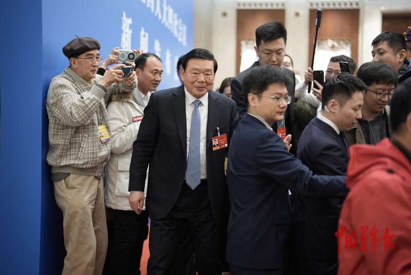 3月4日,北京,人民大会堂,十四届全国人大四次会议新闻发布会结束后,记者们继续采访大会发言人娄勤俭。中青报·中青网记者 李隽辉/摄