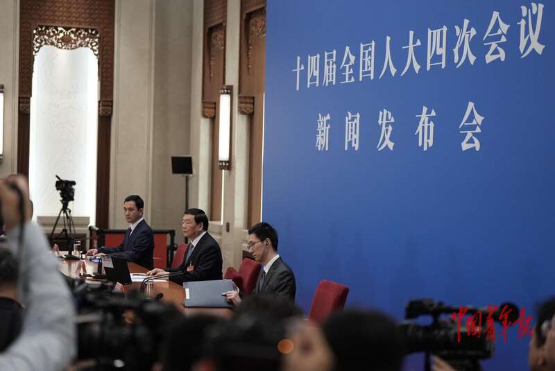3月4日,北京,十四届全国人大四次会议在人民大会堂新闻发布厅举行新闻发布会,大会发言人娄勤俭(中)就大会议程和人大工作相关问题回答中外记者提问。中青报·中青网记者 李隽辉/摄
