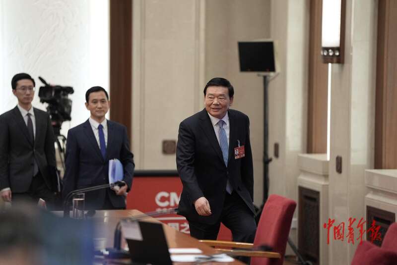 3月4日,北京,十四届全国人大四次会议在人民大会堂新闻发布厅举行新闻发布会,大会发言人娄勤俭(右一)入场,准备就大会议程和人大工作相关问题回答中外记者提问。中青报·中青网记者 李隽辉/摄