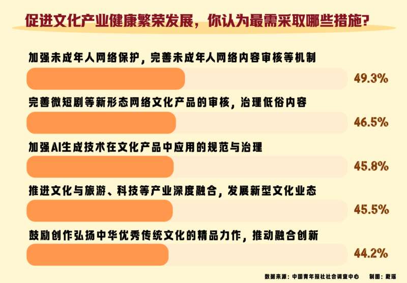 促进文化产业健康繁荣发展,受访者关注的内容还有:完善微短剧等新形态网络文化产品的审核,治理低俗内容(46.5%);加强AI生成技术在文化产品中应用的规范与治理(45.8%);推进文化与旅游、科技等产业深度融合,发展新型文化业态(45.5%);完善社会监督机制,建立有效的举报与处置渠道(44.0%);根据网络文化产品的发展,及时更新相关法律法规(43.0%);设立专项资金,为国产动漫等数字文化产品创作者提供更优质的创作环境(38.2%)等。