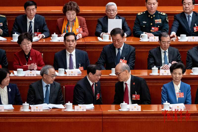 3月9日,北京,十四届全国人大四次会议第二次全体会议开始前,主席台上的代表落座、交流。中青报·中青网记者 李隽辉/摄
