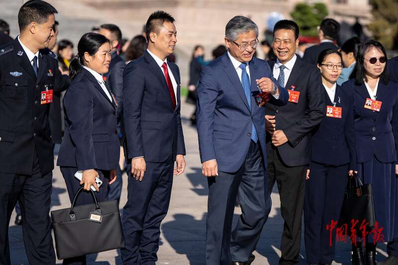3月9日,北京,十四届全国人大四次会议第二次全体会议开始前,全国人大代表、宿迁市委书记盛蕾(中)步入会场。中青报·中青网记者 李隽辉/摄