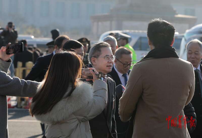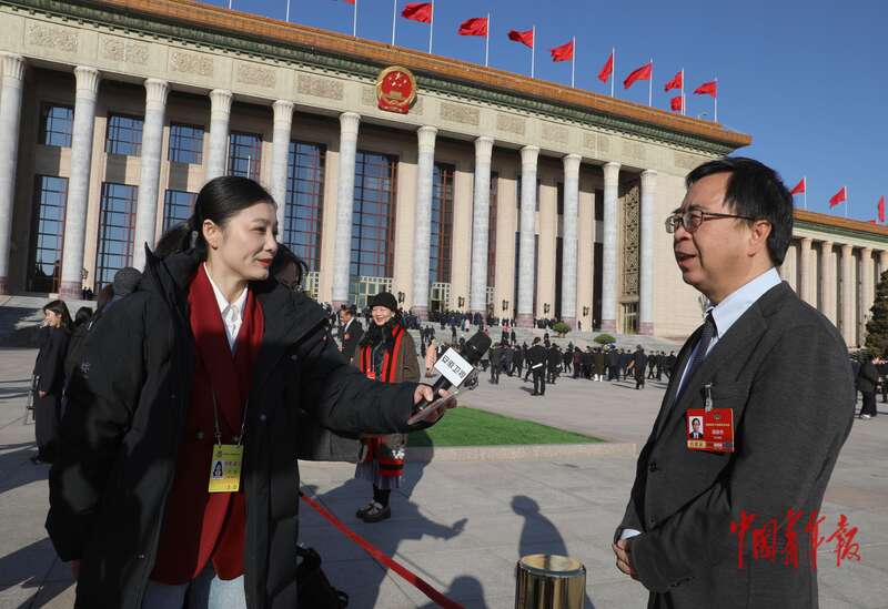 3月11日上午,北京人民大会堂外,全国政协十四届四次会议闭幕会开始前,记者采访全国政协委员、中国驻英国大使郑泽光。中青报·中青网记者 陈剑/摄