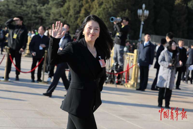 3月11日上午,北京人民大会堂外,全国政协十四届四次会议闭幕会开始前,全国政协委员、中国首枚冬奥金牌获得者杨扬向记者挥手致意。中青报·中青网记者 陈剑/摄
