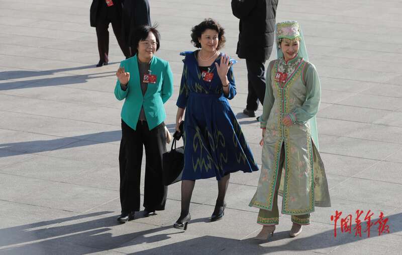 3月11日上午,北京人民大会堂外,全国政协十四届四次会议闭幕会开始前,三位女委员走向会场。中青报·中青网记者 陈剑/摄
