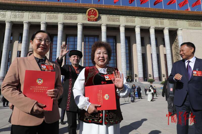 3月11日上午,北京人民大会堂外,全国政协十四届四次会议闭幕会开始前,几位女委员合影留念后喜笑颜开。中青报·中青网记者 陈剑/摄