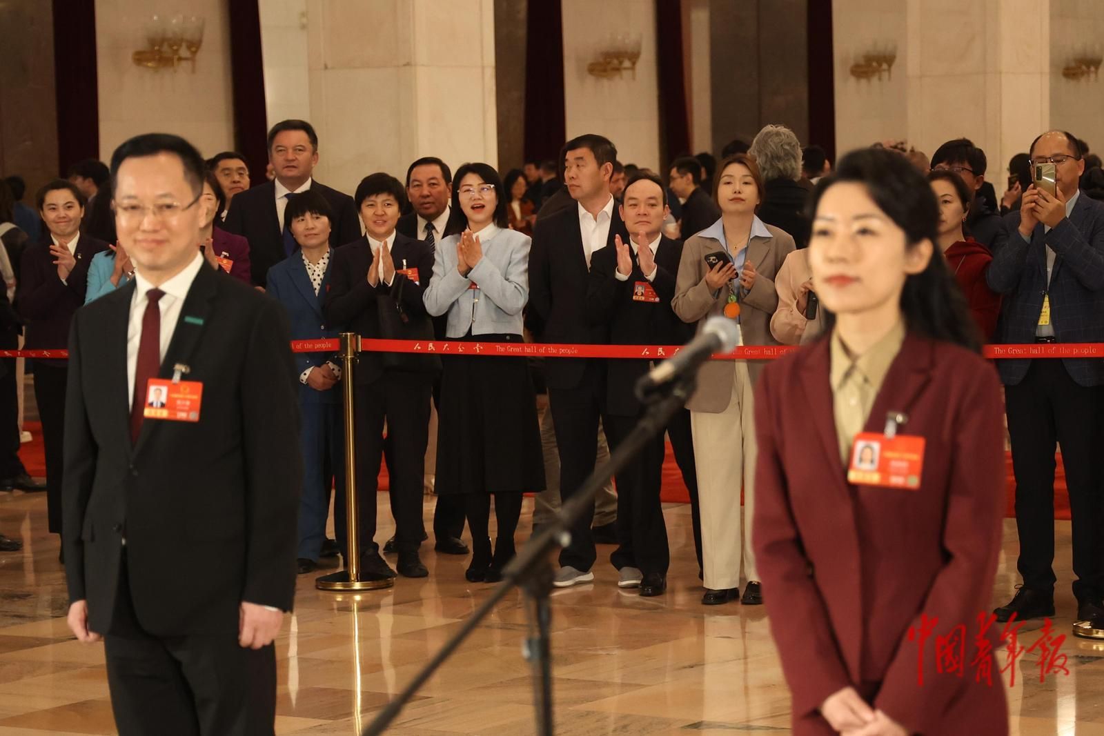 3月12日,北京人民大会堂,十四届全国人大四次会议第三场“代表通道”集中采访活动中,全国人大代表、海南省保亭黎族苗族自治县副县长吕妍(右)回答记者提问。这是今年两会最后一场“代表通道”采访活动,六位全国人大代表先后走上通道,面对中外媒体,讲述履职故事,分享发展感悟。中青报·中青网记者 王鑫昕/摄