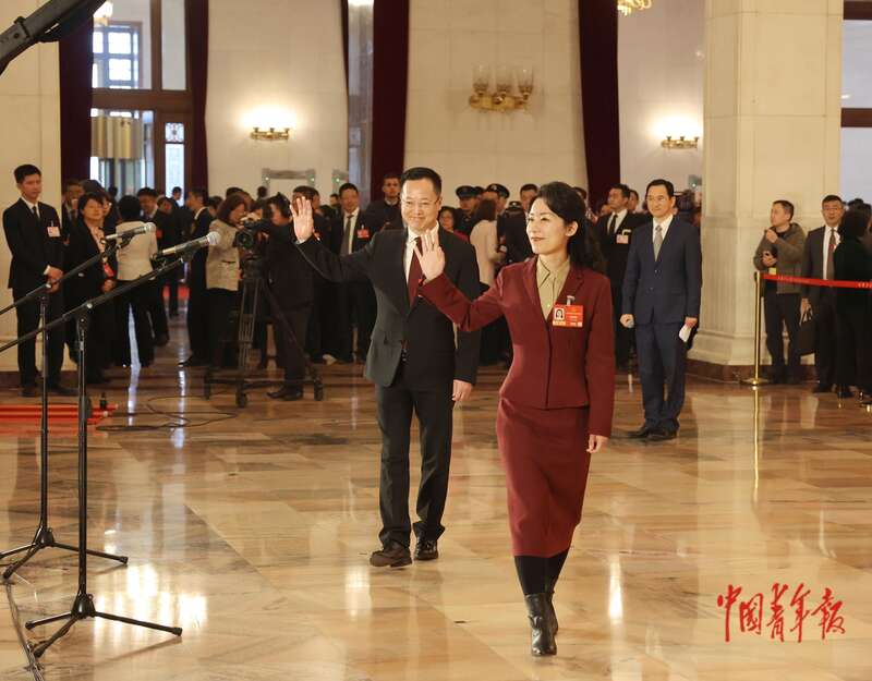 3月12日,北京人民大会堂,十四届全国人大四次会议第三场“代表通道”集中采访活动中,全国人大代表、博发康安控股集团有限公司董事长陆晓琳(前)和全国人大代表、海信集团董事长贾少谦(后)回答完提问后,向记者挥手道别。中青报·中青网记者 王鑫昕/摄
