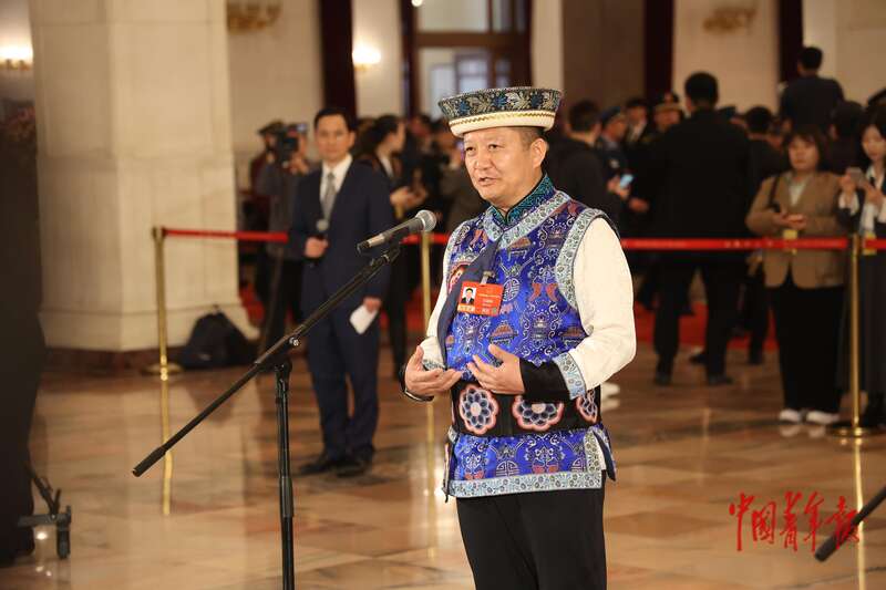3月12日,北京人民大会堂,十四届全国人大四次会议第三场“代表通道”集中采访活动中,全国人大代表、青海省海东市互助土族自治县委书记王国栋接受记者采访。中青报·中青网记者 王鑫昕/摄