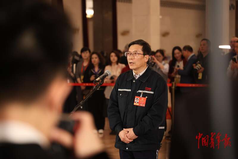 3月12日,北京人民大会堂,十四届全国人大四次会议第三场“代表通道”集中采访活动中,全国人大代表、天津钢管制造有限公司工程师李刚接受记者采访。中青报·中青网记者 王鑫昕/摄