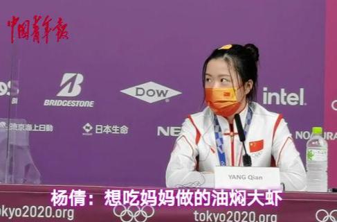 在赛后发布会上,中青报记者替远在宁波的杨倩妈妈问女儿想吃什么,杨倩的答案是:油焖大虾。