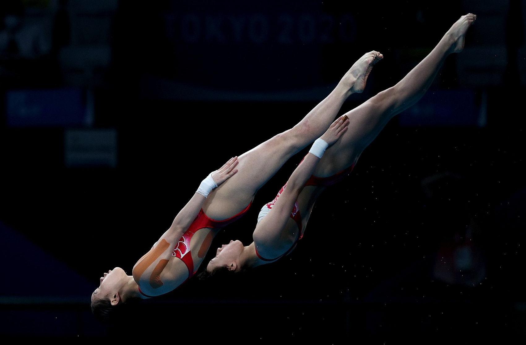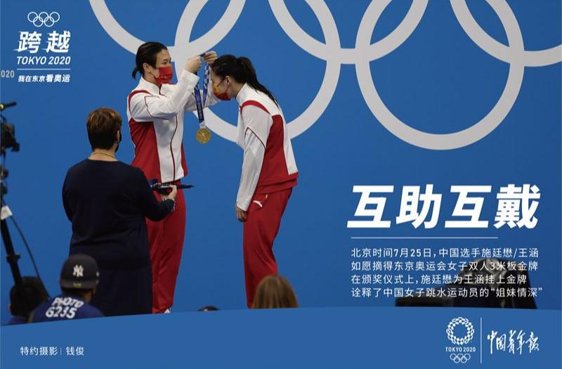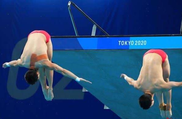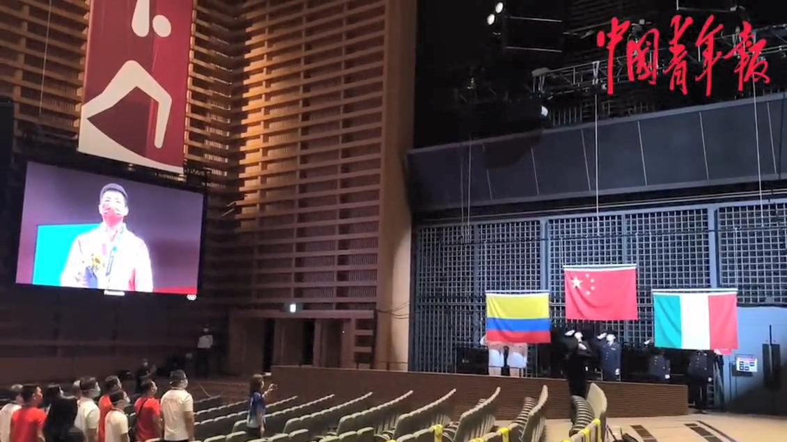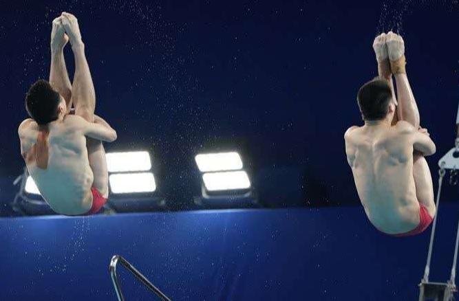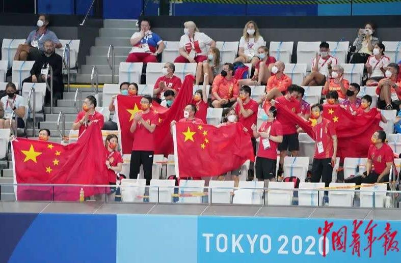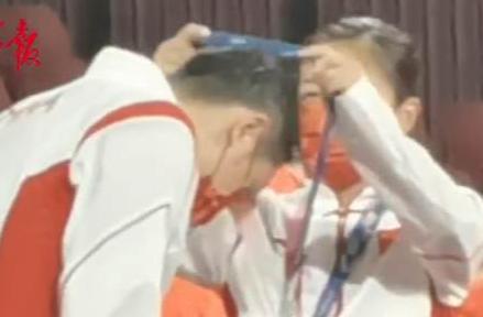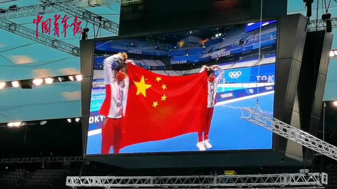 两名跳水小将在颁奖仪式后举着国旗比心,太可爱了。