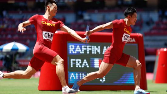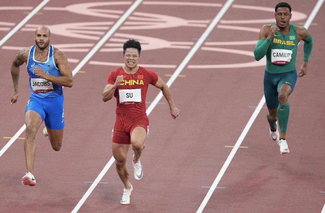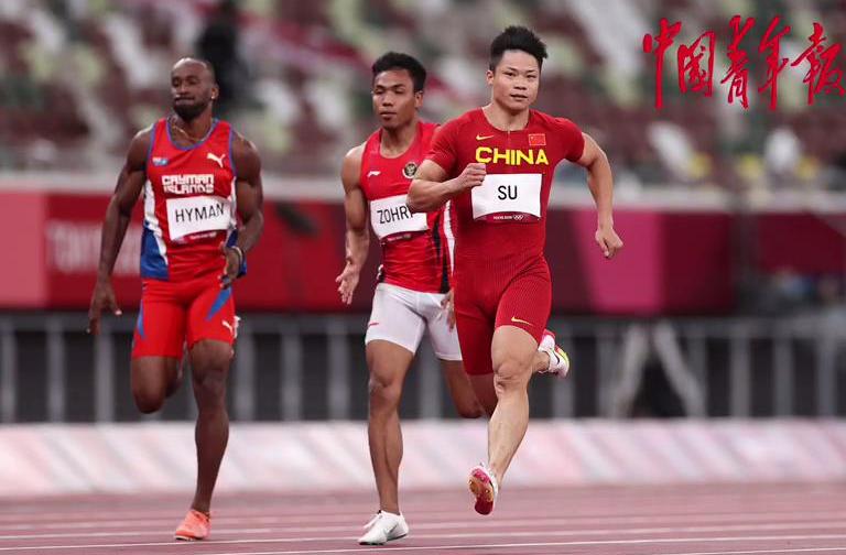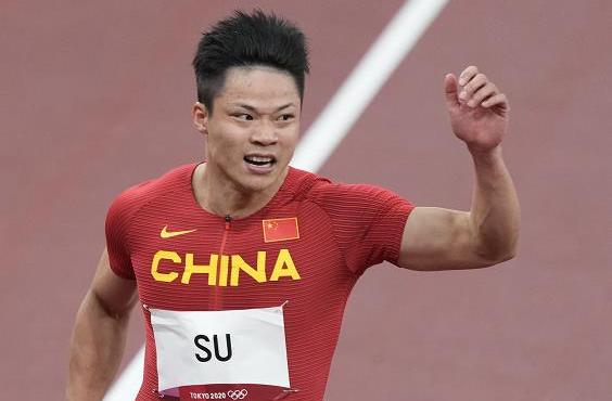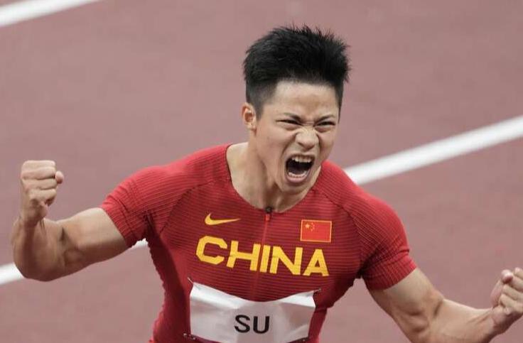 我国短跑名将苏炳添手执五星红旗高高飘扬