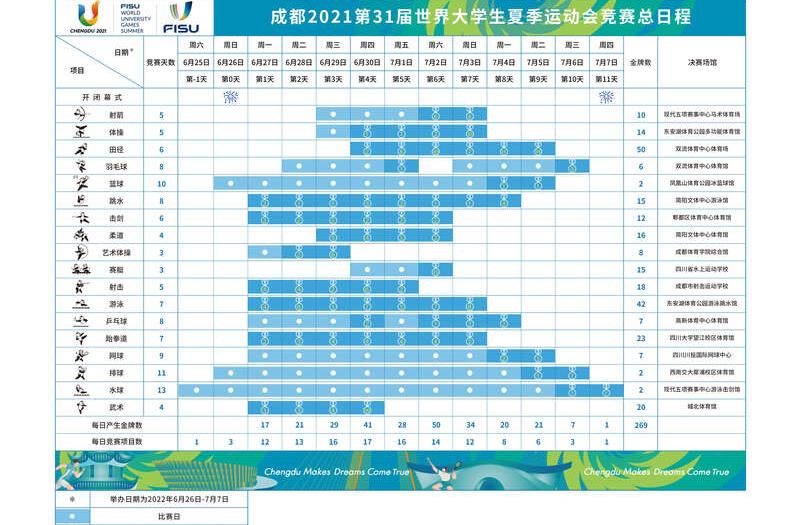 成都2021世界大学生夏季运动会初定于2021年8月8日至19日举办,共设篮球、排球、田径、游泳等18个体育项目,届时预计将有来自约170个国家和地区的1万余名运动员及官员参赛。