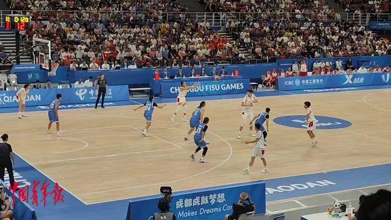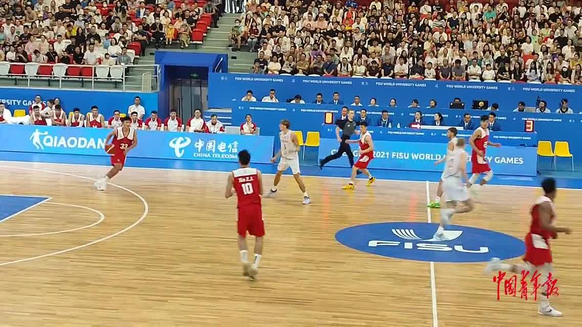 成都大运会男篮排位赛争夺第9名的比赛,8月6日上午在四川省体育中心进行。中国大运男篮在和波兰大运男篮的比赛中,以76:87不敌对手,最终排名本次成都大运会的第10名。上半场比赛,中国大运男篮还能和对手僵持,数据统计显示,双方交替领先9次。但是下半场,波兰大运男篮的外线突然爆发,接连命中4个三分球,而中国男篮单节则出现了8次失误,本节也成为决定本场比赛胜负的关键一节。(中青报·中青网记者杨屾文并摄)