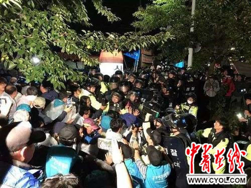 9月7日,在庆尚北道星州郡,装载着剩余4辆“萨德”发射车相关设备的驻韩美军车辆正经由星州郡韶成里村民会馆前往部署基地,遭到当地居民的强烈反对。(图片来源:韩联社)