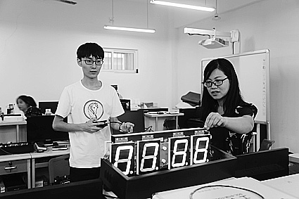 2016年全国职业院校信息化教学大赛在济南职业学院开赛,来自电子工程学院2015级应用电子技术专业3+2本科班的周伟家作为志愿者在服务中注意到,比赛时长不同的赛场上需要频繁更换计时器,而且有的参赛老师抱怨单面显示的计时器面对评委,自己看不到时间,无法掌握比赛节奏……计时器的这些缺陷,催生了他研发复合计时器的想法。他把自己的基础设想详细汇报给了他的导师滕丽丽,得到了老师的肯定与鼓励。在滕老师的指导下,周伟家及其团队成员查阅了许多资料,反复编写修改程序,经历过一次次的改进,终于做出了一款实用性强、外观简洁大方的计时器。
