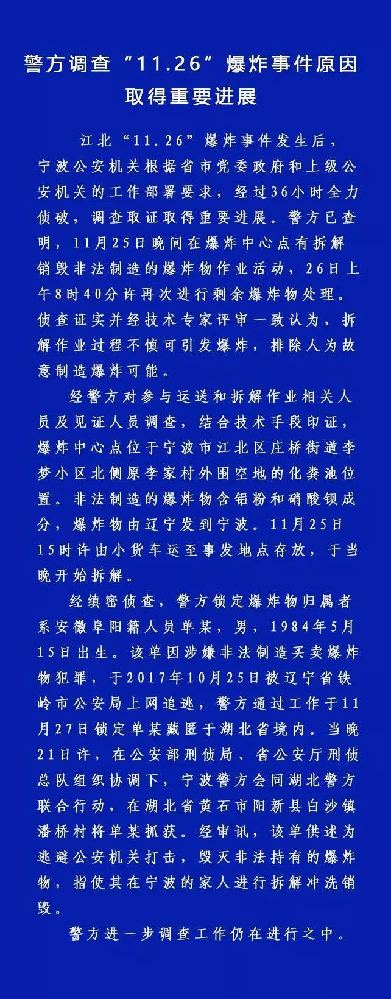 中青在线宁波11月28日电(中国青年报·中青在线记者 董碧水) 据宁波市公安局官方微博最新通报,宁波“11·26”爆炸事件原因调查取得重要进展,系拆解销毁爆炸物时操作不慎引发爆炸。据警方通报,爆炸物归属者系逃犯单某,男,安徽阜阳人,1984年5月出生,其在指使家人拆解销毁爆炸物时操作不慎引发爆炸,单某已在湖北被抓获。