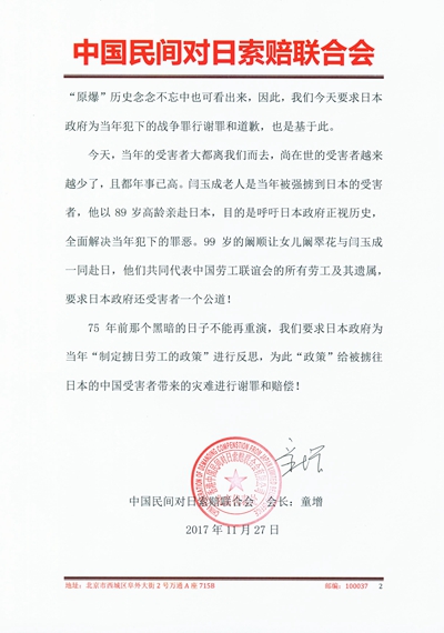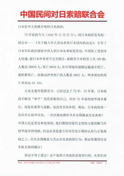 11月27日,中国民间对日索赔联合会致函日本驻华大使横井裕并日本政府,要求日本政府就当年制定强掳中国劳工的“政策”进行反思,为当年被掳往日本的中国受害者带来的灾难谢罪和赔偿。