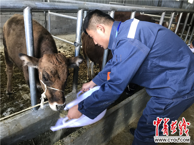 崔亚华正在肉牛养殖基地给牛喂食。中国青年报·中青在线记者 董志成/摄