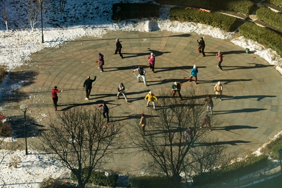 元旦的早晨,63岁的董胜在自家窗前举起相机,又一次拍下了窗外的北京。“生存在立体空间,透过楼群的空隙望出去:天上飞的,轨道上穿梭的,地上跑的、走的……重修的古角楼,新建的幼儿园、医院、楼群……时空交织,世事繁复。”她为这张图片写下了这样的文字。