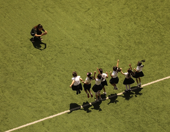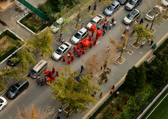 从家里的窗户望出去,附近的幼儿园、中小学等尽收眼底,家长接送、上学放学等热闹的瞬间正是忙着照顾儿孙的时候,她只能抽空抓拍。身着红衣抬着花轿的迎亲队伍、林荫下奔忙的上班族、居民楼下突然出现的救护车、对面楼里彻夜亮着的一盏台灯……她从高处记录下片段,揣摩着窗外生活的全貌。