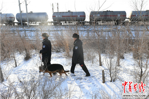 在车站调度室了解完当天的运行计划,民警韩开云和梁冬便开始行动。“现在正是迎接开展2018年春运的节骨眼儿,要确保高铁安全不能有一点儿的马虎。”韩开云对梁冬嘱咐。话罢,二人像往常一样带齐装备,牵着警犬,一前一后行走在漫长的铁路线上。贺瑞明/摄