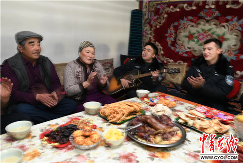 除日常巡线之外,盐湖警务区的民警还会走进周边牧民家里进行爱路护路宣传工作,挨家挨户发放宣传资料,增强周边牧民爱路护路意识和自我保护意识。吐尔逊大叔和老伴是辖区内普通的一户人家,老两口的四个女儿都远嫁外地,平日里家里只有两位老人。民警们在走访时了解到老人家里的情况后,时常去老人家探望,送去温暖和关怀。1月6日,恰逢吐尔逊老人60岁生日,孩子们都因为忙碌无法赶回家陪老人过生日,民警们自发组织为老人庆祝,带上吉他表演才艺,在一片欢声笑语中为老人送上生日祝福。贺瑞明/摄