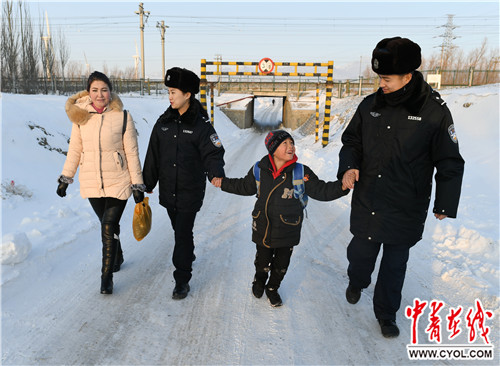 6岁的小买力父母常年在牧场放牧,家里只有他和72岁的奶奶相依为命。入冬降雪以来,天冷路滑,老人家出行多有不便,民警何晓帆与战友李连杰经常接送买力上学。上周,小买力的妈妈从牧场回到村里,接孩子放学的路上遇到巡线的民警,小买力亲切地牵着警察哥哥和姐姐的手,民警护送母子俩安全通过涵洞。贺瑞明/摄