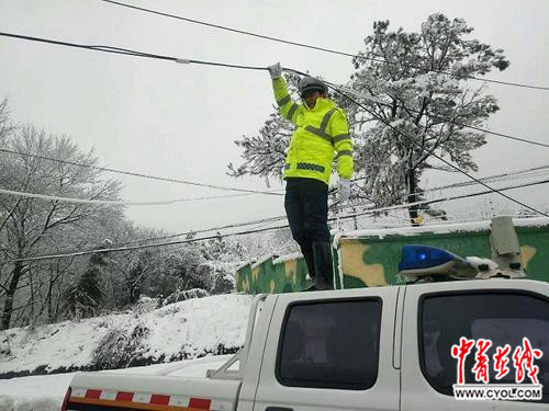 中午11点左右,接群众报警后,下蜀中队执勤民警赶到现场处置。许庭忠介绍说,电缆线垂落的地方为下坡加转弯路段,到现场时,路上已经有拥堵。当时大雪已停,仍下着小雪,路上积雪约10公分厚,电缆距地面不足2米高。民警立刻联系附近部队,对方答复会即刻上报派人处理。等待过程中,随同执勤的辅警许庭忠将警车开到路边,并爬上车顶,整理拉直电缆后,用手高举电缆,让堵住的车辆畅通行驶。直到部队派人修好,他在寒风中举了30分钟左右。
