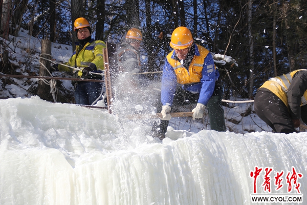 伊春桥梁保养工区的职工每周都会对这处山泉积冰进行检查,在安全风险隐患形成之前,及时对“冰瀑布”进行清除。