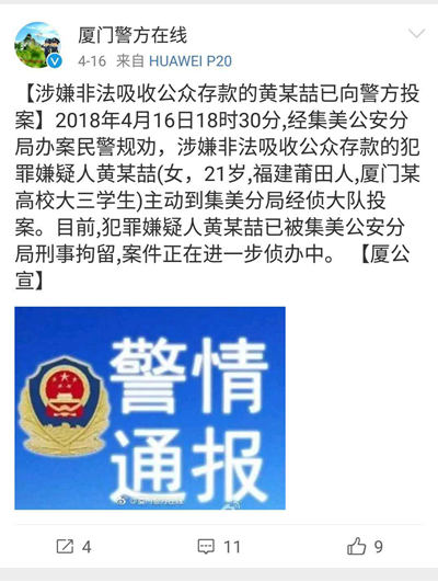 4月16日,厦门市公安局通过官方微博发布消息称,21岁的厦门某高校大三女生黄某喆自2017年12月起以吸引投资并承诺高额利息为名,通过让人直接转账汇款或用“蚂蚁花呗”套现支付等方式套取钱款。当天傍晚,涉嫌非法吸收公众存款的犯罪嫌疑人黄某喆主动向警方投案,现已被警方刑事拘留。