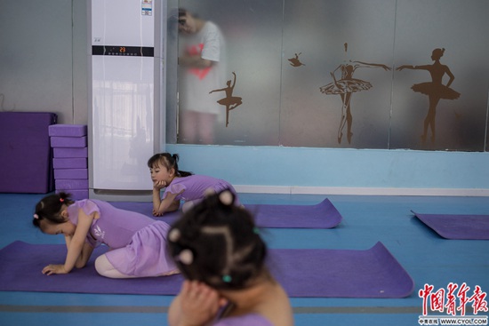 舞蹈课上,等候的家长从玻璃墙缝隙向教室内张望。