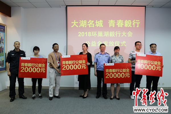 中青在线合肥5月31日电(中国青年报·中青在线见习记者王海涵 记者 王磊) 5月31日上午,团合肥市委在合肥市公安局特警支队举办2018环巢湖毅行大会公益金发放仪式。合肥市红十字会、团合肥市委、安徽省青少年发展基金会、合肥市公安局相关领导及毅行大会捐赠者代表、受捐赠家庭代表参加仪式。