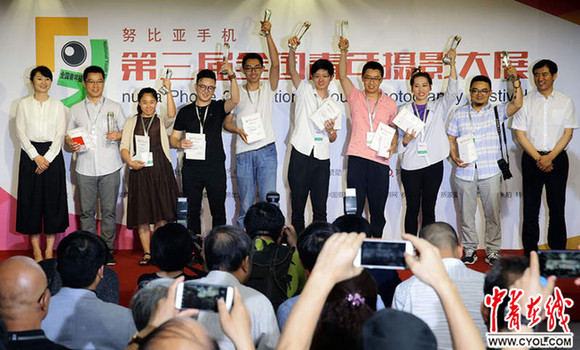 6月8日,第三届全国青年摄影大展首展开幕式上,获奖的青年摄影师上台领奖。中国青年报·中青在线记者 陈剑/摄