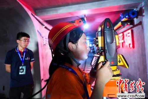 参赛选手正在第六届全国煤炭职业院校技能大赛矿山测量技术赛项中进行井下15秒级导线测量