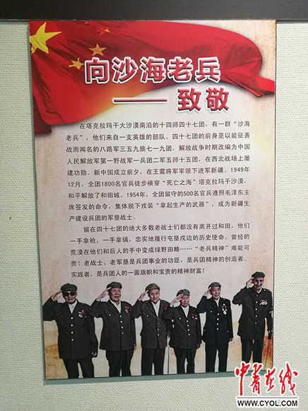 1949年12月,全团1800名官兵徒步横穿“死亡之海”塔克拉玛干沙漠,和平解放了和田城。1954年,全团留守的500名官兵遵照毛泽东主席签发的命令,集体脱下戎装“拿起生产的武器”,成为新疆生产建设兵团的军垦战士。中国青年报·中青在线记者 郭艳丽/摄